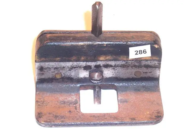 The blade has a right angle bend to then project forward and is 1/8 in. wide. The blade is made from a smoothed triangular file. A machine screw threaded through the front angle tightens the blade in position.